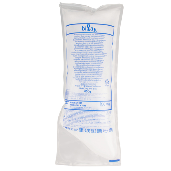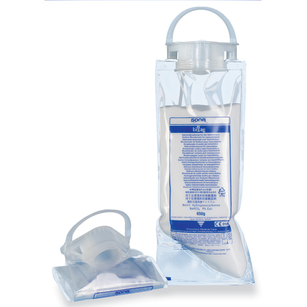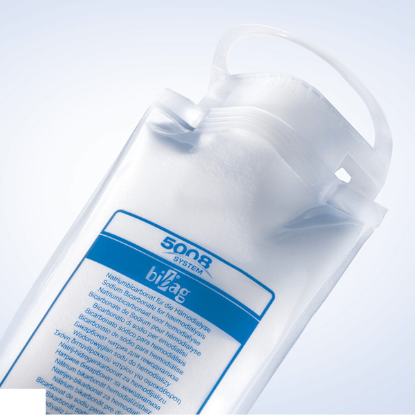 La función del BIBAG (Bicarbonato de Sodio) es completar los miliequivalentes de sodio necesarios para que pueda realizarse la diálisis cuando se mezcla con concentrados ácidos para hemodiálisis (1+34 o 1+44) a través de conexión directa a la máquina de diálisis.
